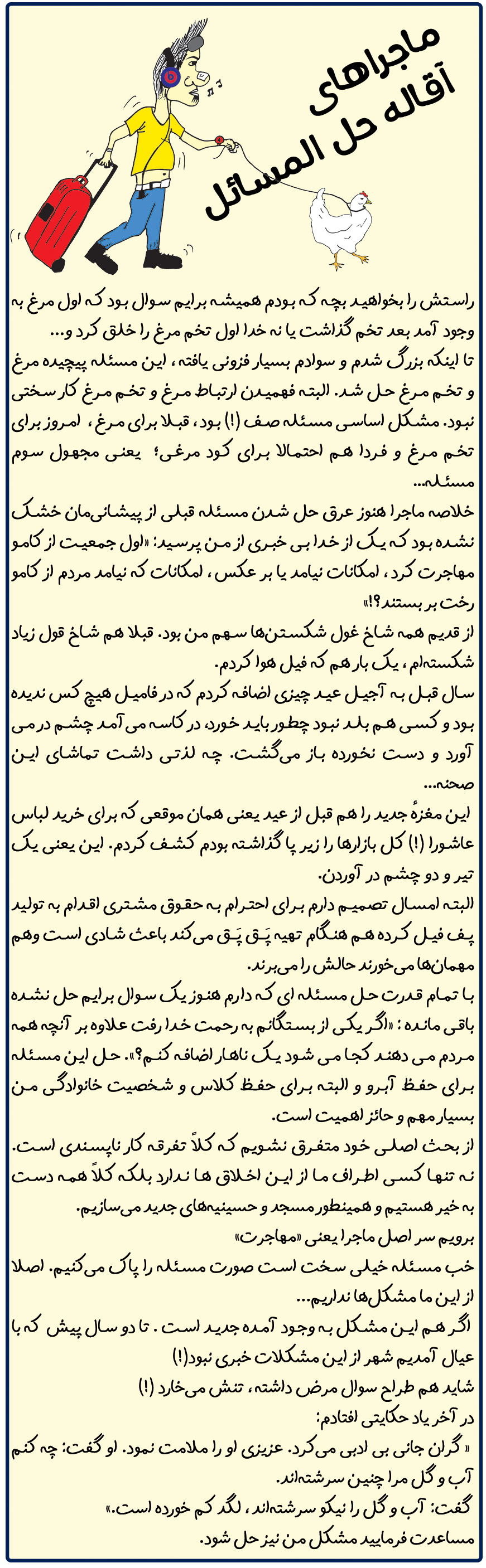 تا اینکه بزرگ شدم و سوادم بسیار فزونی یافته ، این مسئله پیچیده مرغ و تخم مرغ حل شد. البته فهمیدن ارتباط مرغ و تخم مرغ کار سختی نبود. مشکل اساسی مسئله صف (!) بود ، قبلا برای مرغ ،  امروز برای تخم مرغ و فردا هم احتمالا برای کود مرغی؛  یعنی مجهول سوم مسئـله...