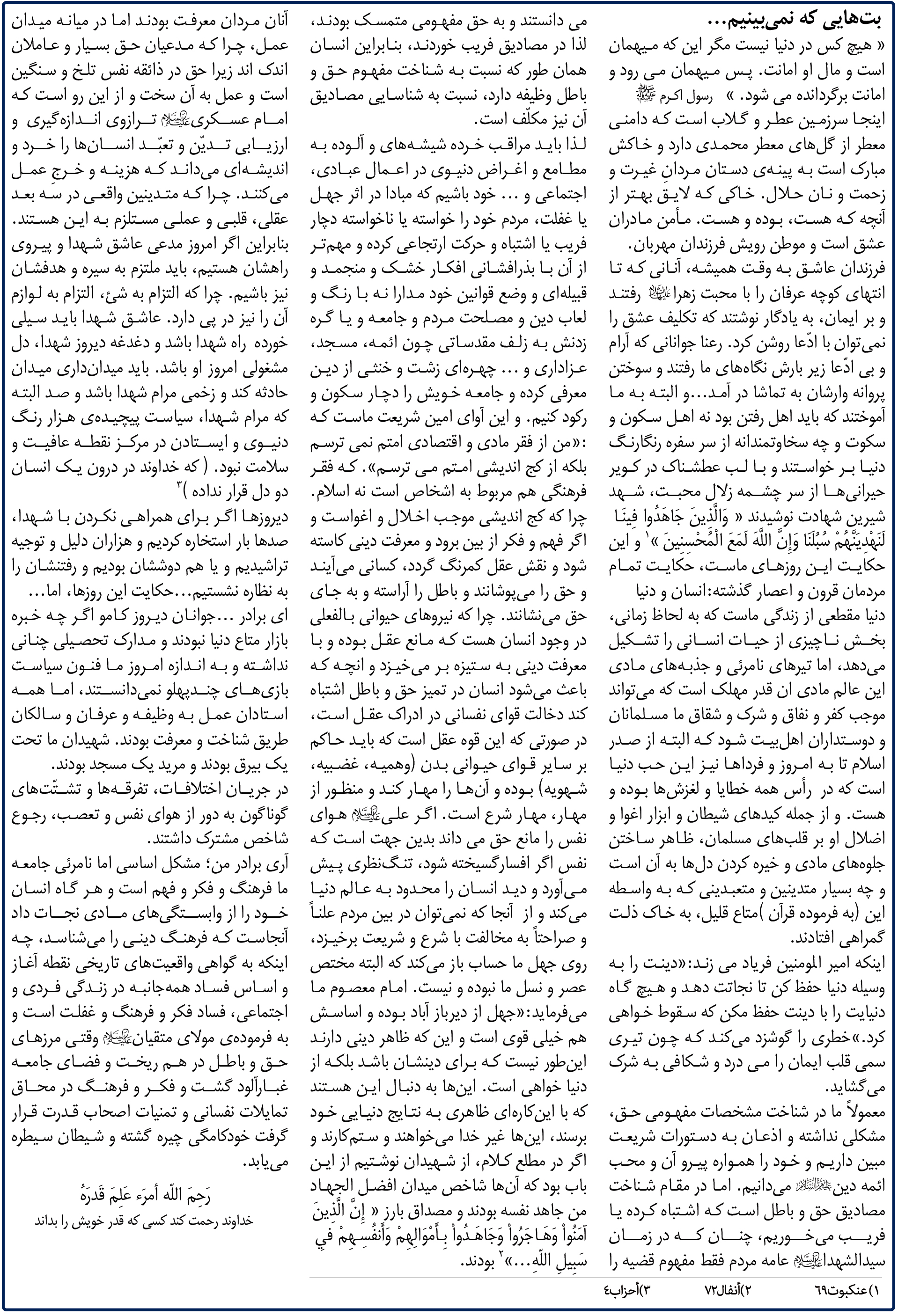 آنان مردان معرفت بودند اما در میانه میدان عمل، چرا که مدعیان حق بسیار و عاملان اندک اند زیرا حق در ذائقه نفس تلخ و سنگین است و عمل به آن سخت و از این رو است که امام عسکریj ترازوی اندازه‌گیری  و ارزیابی تدیّن و تعبّد انسان‌ها را خرد و اندیشه‌ای می‌داند که هزینه و خرجِ عمل می‌کنند. چرا که متدینین واقعی در سه بعد عقلی، قلبی و عملی مستلزم به این هستند. بنابراین اگر امروز مدعی عاشق شهدا و پیروی راهشان هستیم، باید ملتزم به سیره و هدفشان نیز باشیم. چرا که التزام به شئ، التزام به لوازم آن را نیز در پی دارد. عاشق شهدا باید سیلی خورده  راه شهدا باشد و دغدغه دیروز شهدا، دل مشغولی امروز او باشد. باید میدان‌داری میدان حادثه کند و زخمی مرام شهدا باشد و صد البته که مرام شهدا، سیاست پیچیده‌ی هزار رنگ دنیوی و ایستادن در مرکز نقطه عافیت و سلامت نبود. ( که خداوند در درون یک انسان دو دل قرار نداده )3