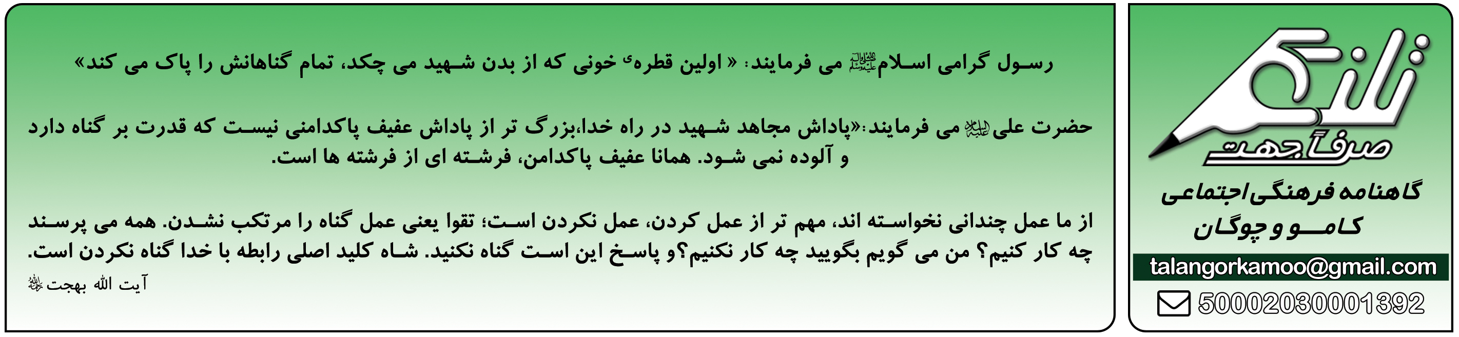 ای برادر ...جوانان دیروز کامو اگر چه خبره بازار متاع دنیا نبودند و مدارک تحصیلی چنانی نداشته و به اندازه امروز ما فنون سیاست بازی‌های چندپهلو نمی‌دانستند، اما همه استادان عمل به وظیفه و عرفان و سالکان طریق شناخت و معرفت بودند. شهیدان ما تحت یک بیرق بودند و مرید یک مسجد بودند.