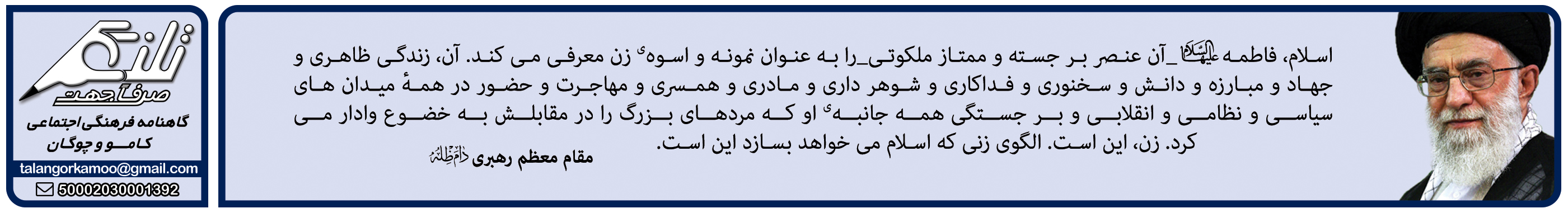 بهترین زنان عالم، فاطمه زهرا سلام الله علیها الگوی انسان های شیفته ی کمال و به ویژه زنان پویای راه سعادت است. فاطمه سلام الله علیها نمونه ی کامل و گویا برای زنانی است که در پی زندگی راستین و حرکت در مسیر درست آنند. افزون بر کمالاتی چون عبادت خالصانه، ایثار و معرفت بی پایان، در مقام همسری و تربیت فرزندان، محیط خانه او مهد تربیت بهترین اولیا خدا بود. فاطمه سلام الله علیها بهترین شریک زندگی و مادری نمونه برای علی علیه السلام و فرزندانش بود.                    امام خمینی رحمة الله علیه