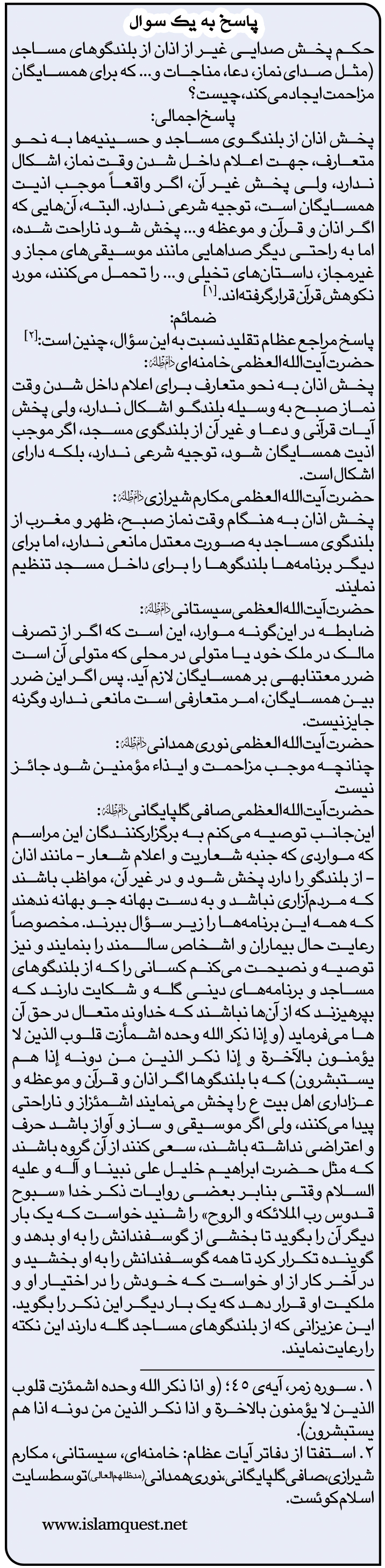 پخش اذان از بلندگوی مساجد و حسینیه‌ها به نحو متعارف، جهت اعلام داخل شدن وقت نماز، اشکال ندارد، ولی پخش غیر آن، اگر واقعاً موجب اذیت همسایگان است، توجیه شرعی ندارد. البته، آن‌هایی که اگر اذان و قرآن و موعظه و... پخش شود ناراحت شده، اما به راحتی دیگر صداهایی مانند موسیقی‌های مجاز و غیرمجاز، داستان‌های تخیلی و... را تحمل می‌کنند، مورد نکوهش قرآن قرارگرفته‌اند. [1]
