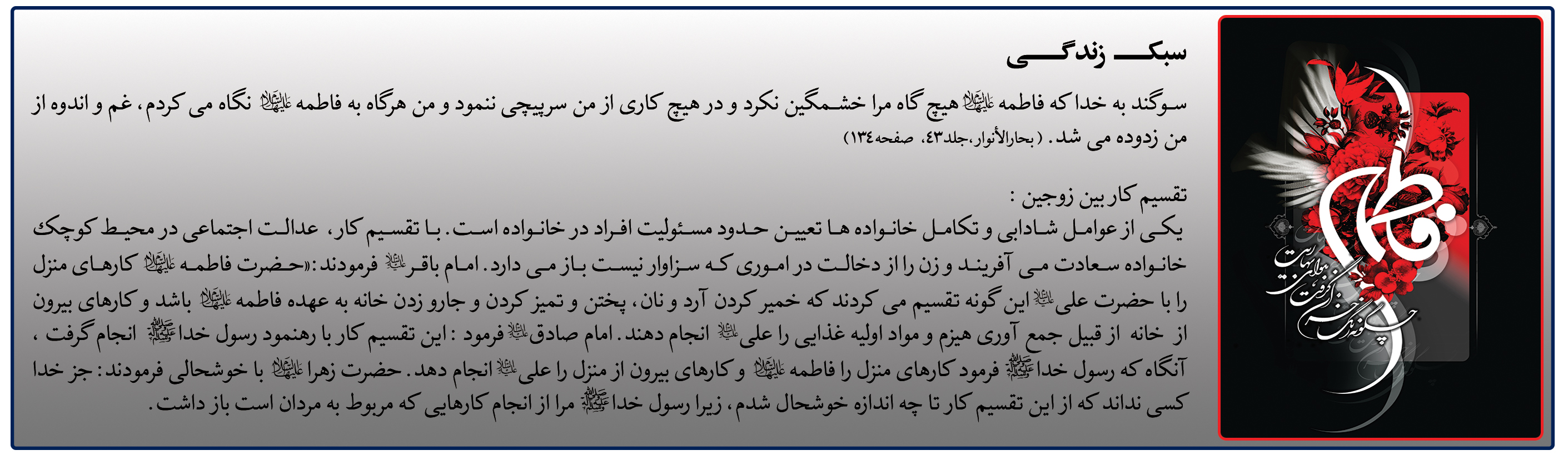 یکی از عوامل شادابی و تکامل خانواده ها تعیین حدود مسئولیت افراد در خانواده است. با تقسیم کار،  عدالت اجتماعی در محیط کوچک خانواده سعادت می آفریند و زن را از دخالت در اموری که سزاوار نیست باز می دارد. امام باقرl  فرمودند:«حضرت فاطمه; کارهای منزل را با حضرت علیl این گونه تقسیم می کردند که خمیر کردن آرد و نان، پختن و تمیز کردن و جارو زدن خانه به عهده فاطمه; باشد و کارهای بیرون از  خانه  از قبیل جمع آوری هیزم و مواد اولیه غذایی را علیl  انجام دهند. امام صادقl فرمود : این تقسیم کار با رهنمود رسول خدا[  انجام گرفت ، آنگاه که رسول خدا[ فرمود کارهای منزل را فاطمه; و کارهای بیرون از منزل را علیl انجام دهد. حضرت زهرا; با خوشحالی فرمودند: جز خدا کسی نداند که از این تقسیم کار تا چه اندازه خوشحال شدم، زیرا رسول خدا[ مرا از انجام کارهایی که مربوط به مردان است باز داشت.
