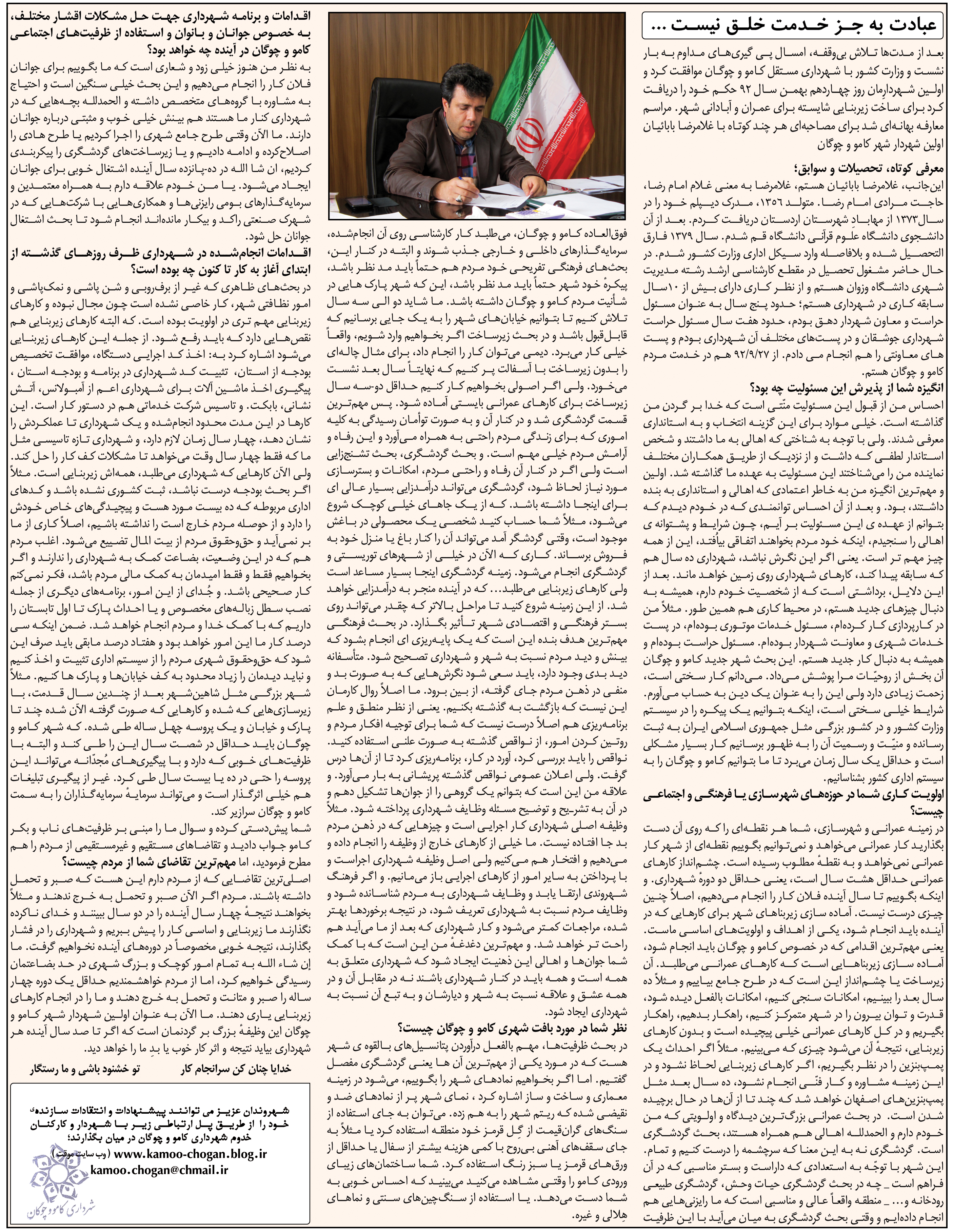 بعد از مدت‌ها تلاش بی‌وقفه، امسال پی گیری‌های مداوممان به بار نشست و وزارت کشور با شهرداری مستقل کامو و چوگان موافقت کرد و اولین شهردارمان روز چهاردهم بهمن سال 92 حکم خود را دریافت کرد برای ساخت زیربنایی شایسته برای عمران و آبادانی شهر. مراسم معارفه بهانه‌ای شد برای مصاحبه‌ای هر چند کوتاه با غلامرضا بابائیان اولین شهردار شهر کامو و چوگان: